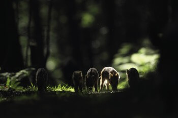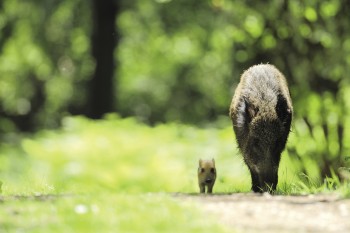 Cette découverte me rend euphorique. Le gîte est visiblement abandonné et la troupe de marcassins et leurs parents ont probablement déjà pris le chemin du sous-bois. Dès le lendemain, je poursuivrai ma quête… Pendant plusieurs jours, je piste discrètement les pérégrinations de la petite compagnie. Le soir, dans la futaie sombre, j’aperçois le dos noir d’un sanglier. Quelques instants plus tard, une boule de poils se faufile entre les pieds des fougères. Enfin la première rencontre ! La famille se compose de cinq jeunes marcassins et de leur mère. Quant au père, il est déjà reparti pour vivre sa vie paisible de mâle solitaire.