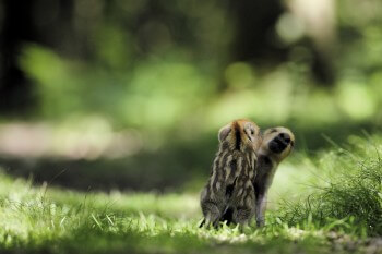 Au fil des jours, les tête-à-tête se répètent. Aux abords de chemins forestiers, la vue dégagée me permet de détecter le pyjama rayé des marcassins. Le quotidien des cochonnets se résume à quelques activités insouciantes : fouiller la litière du sous-bois avec leur petit groin à la recherche de lombrics, se frotter contre les souches pour se débarrasser des parasites ou, plusieurs fois par jour, téter du lait de leur mère. Ce long apprentissage de vie leur demande beaucoup d’énergie. Agés d’à peine deux semaines, les marcassins se fatiguent vite. Une bonne sieste entre fougères et feuilles mortes… et c’est reparti pour explorer le monde !