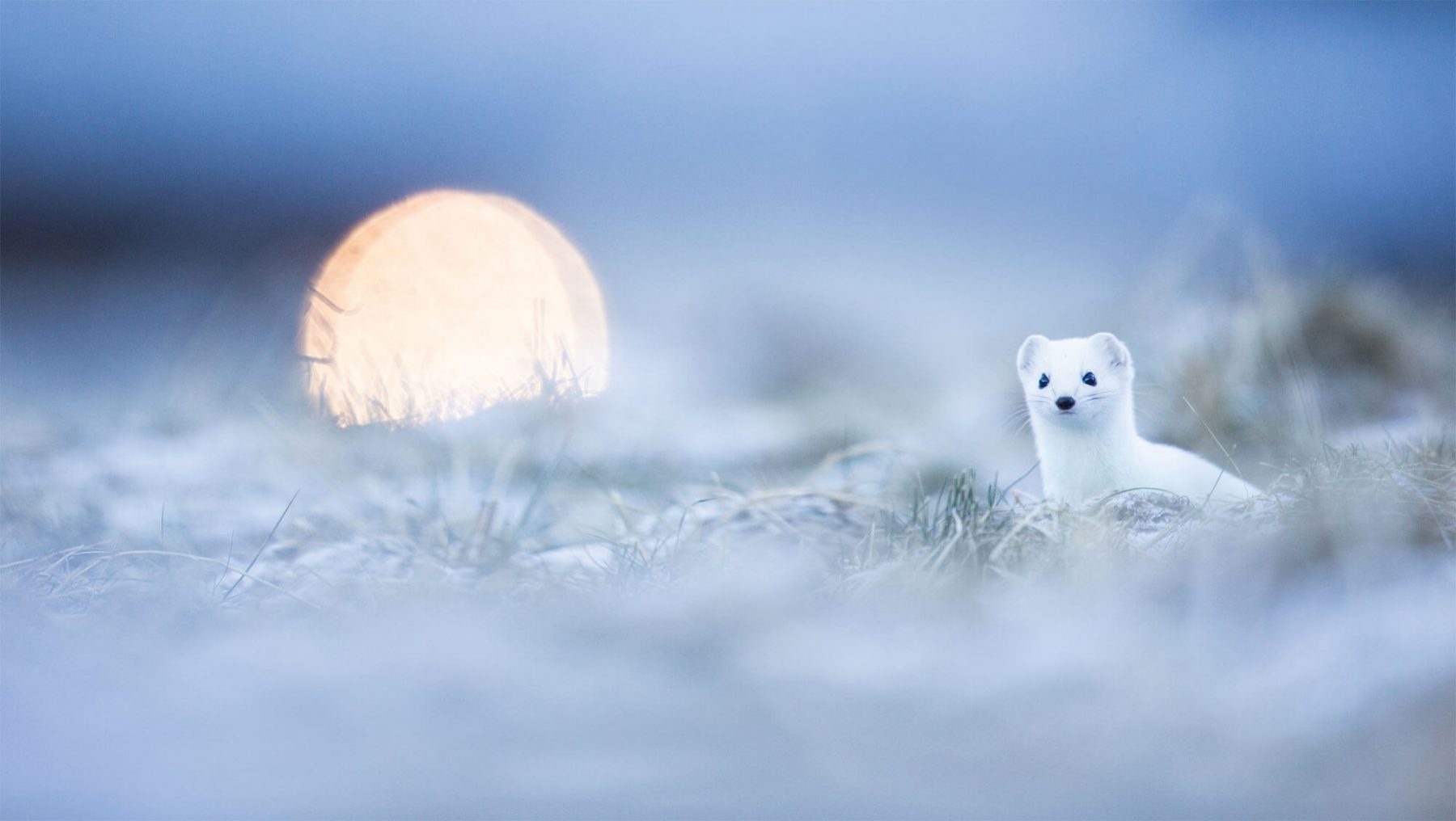 Mon image favorite reste celle où ma voisine l’hermine regarde malicieusement dans ma direction. Au même moment, une étrange sphère lumineuse brille entre les herbes givrées. On dirait un coucher de soleil ou un lever de lune. En fait, c’est simplement un lampadaire de la piscine communale.