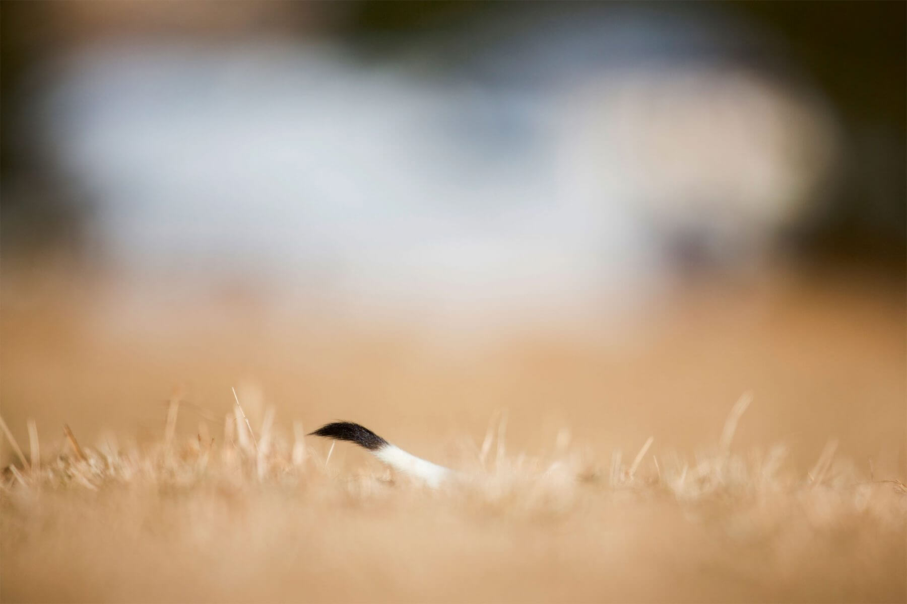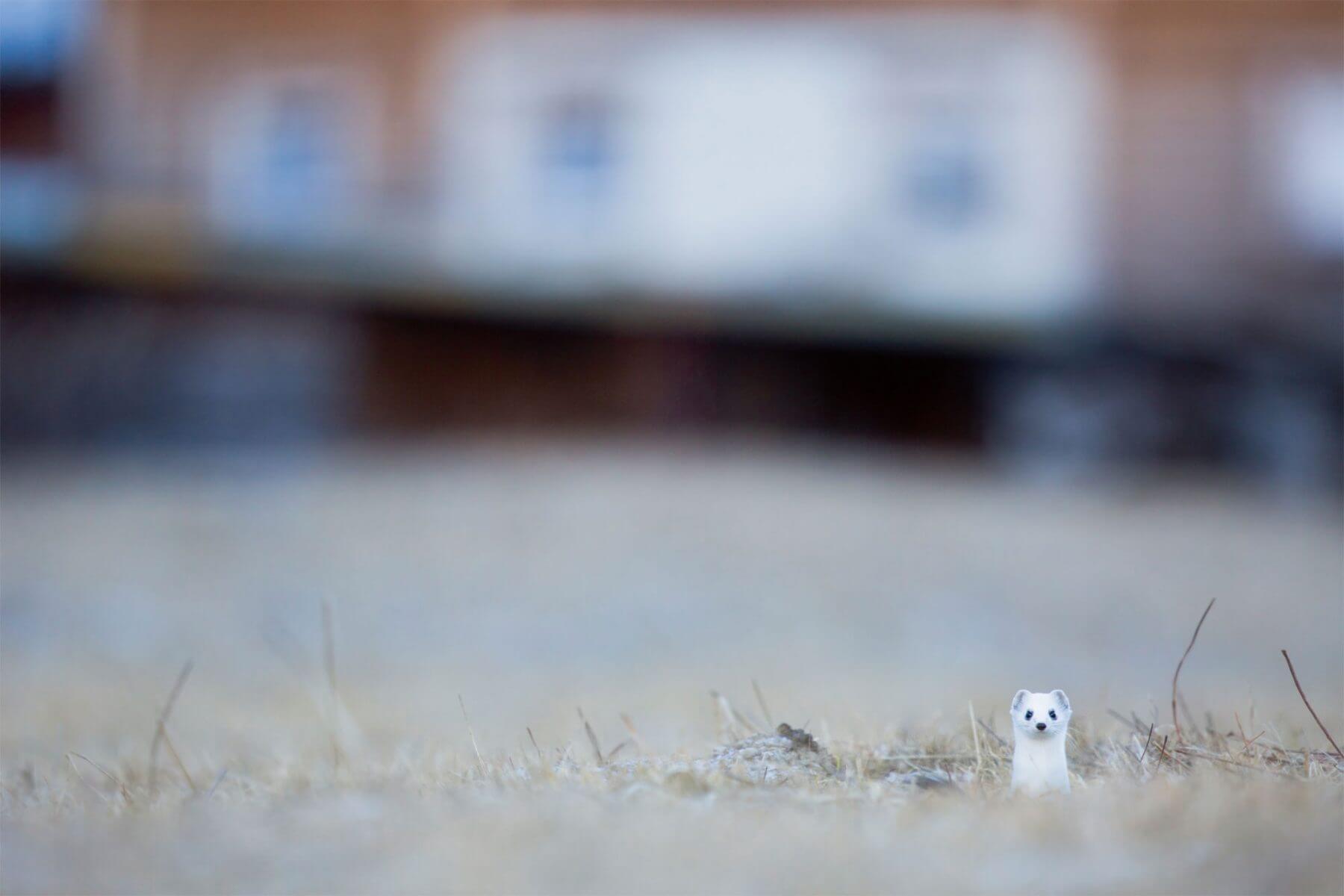 Plutôt furtif, ce mustélidé est toutefois peu farouche : une fois repérée, l’hermine se laisse facilement observer, surtout lorsqu’elle s’est aventurée à deux pas des maisons. Surpris et ravi de l’arrivée de cette nouvelle voisine, j’épie son comportement et ses habitudes. Pendant mes observations, j’étudie aussi les angles potentiels de prise de vue et les cadrages afin de photographier l’animal de manière originale. Plutôt que d’exclure les éléments humains, je les intègre à mes compositions photographiques. Ce parti pris, impensable en pleine nature, est la règle sur cette prairie au milieu des chalets. A l’aide du diaphragme, je travaille la profondeur de champ pour retranscrire la relation homme-animal si harmonieuse dans mon hameau oublié. J’assume la présence d’un soupçon de grange en arrière-fond et accueille la silhouette d’une voiture dans mon cadrage.