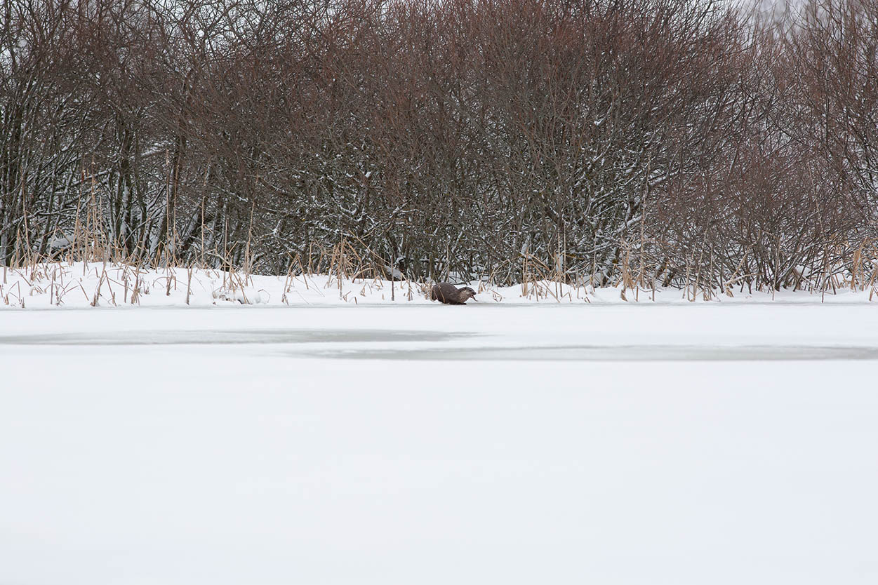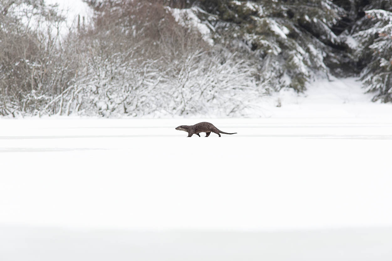 C’est bien une loutre ! Elle vaque à ses occupations, courant sur la glace, en plein jour et totalement à découvert ! Commence alors une partie de 1, 2, 3, soleil. Je profite de chacune de ses apnées sous la glace pour me rapprocher de mon poste d’affût.