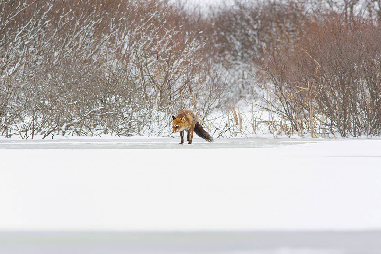 Tout à coup, la loutre jaillit du trou et mord le goupil à l’épaule. Le renard repart au trot, la queue entre les pattes et l’air penaud. À l’époque, j’étais moins expérimenté qu’aujourd’hui. En raison de la rapidité de l’action, toutes les photos que j’ai prises sont floues... Qu’importe, je ne sens plus le froid tant l’instant est unique.