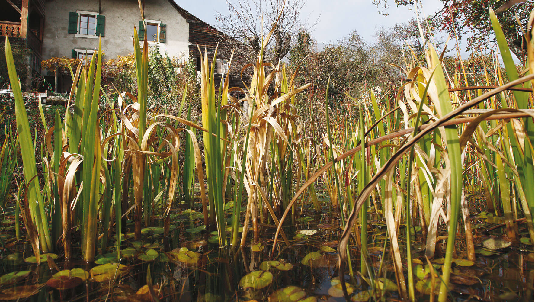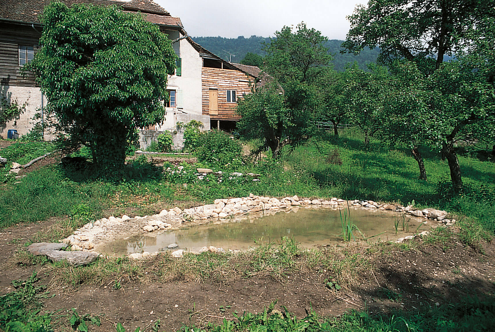 En été, il peut être nécessaire de rajouter de l’eau dans l’étang si son niveau baisse trop fort.
