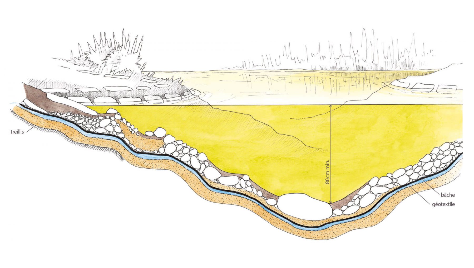 Un point d’eau de 3 ou 4 m2 suffit déjà au bain des oiseaux et à quelques invertébrés aquatiques. A partir de 7 m2, la surface devient intéressante pour les amphibiens et autorise une plus grande diversité végétale. Variez au maximum le profil de la mare, en aménageant des berges en pente douce et d’autres abruptes, et en créant des paliers. Prévoyez au moins un endroit profond de 80 cm : cette profondeur assurera un minimum d’eau libre en été en cas de sécheresse et, en hiver, quand il gèle à pierre fendre.