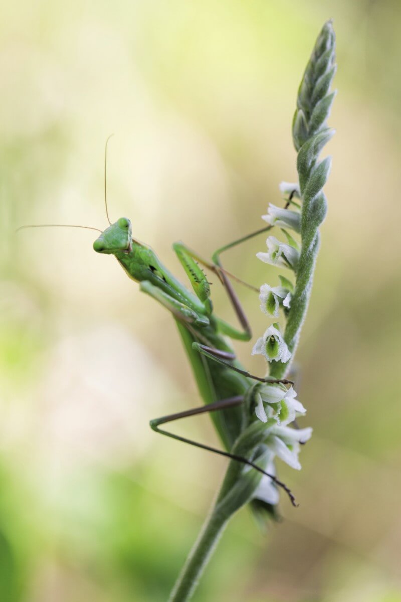 La dernière espèce à fleurir est nettement plus tardive que toutes les autres. Il faut attendre que les pluies de fin d’été viennent déclencher son émergence. Selon les années et les régions, la spiranthe d’automne peut sortir fin août ou même patienter jusqu’en octobre. Notre quête commence habituellement en Valais, au-dessus des vignobles qui dominent le Rhône. Cette année, la pluie n’a pas été abondante. Pas la moindre hampe florale à l’horizon. De plus, impossible d’anticiper la recherche de cette plante par un repérage des rosettes. Chez la spiranthe d’automne, ces feuilles caractéristiques de la famille des orchidées n’apparaissent qu’après la floraison. Heureusement, l’herbe sèche cache difficilement les mantes religieuses en pleine période de reproduction. A défaut d’orchidées, elles occupent la promenade.