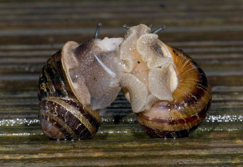 Contrairement à beaucoup d’escargots, la veloutée plane n’a pas de dard d’amour. Cette sorte de harpon calcaire, présent par exemple chez le très commun petit-gris (> photo), pourrait être à l’origine du mythe de Cupidon. Avant l’échange de sperme réciproque, les deux mollusques tentent de planter cette flèche à bout portant dans leur partenaire. Le mucus dont elle est entourée contient une substance hormonale favorisant la survie des spermatozoïdes et donc le succès de la reproduction.