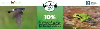 Du vendredi 27 au dimanche 29 novembre 2020, 10% de tous les achats réalisés sur la boutique en ligne seront reversés au profit de la protection de l’hirondelle de fenêtre (en Suisse) et de la rainette verte (en France).