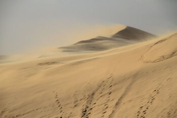 Février, le vent d'ouest s'est renforcé sur les Landes de Gascogne. L'ascension de la dune du Pilat prend une tournure épique. Le sable propulsé s'infiltre partout et fouette l’œil. Au sommet, la révélation d'un panorama à couper le souffle, mais impossible de se tenir debout. Océan déchaîné, banc d'Arguin naufragé, plages désertes et là, juste au nord, l'imposante lagune du bassin d'Arcachon. Au sens propre, comme au figuré, on en prend plein les yeux !
