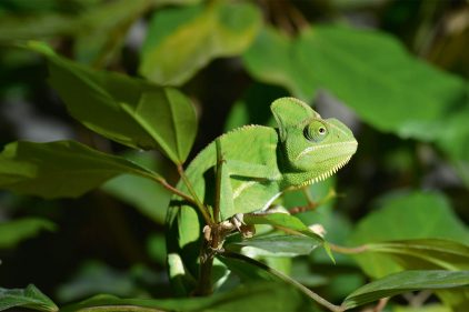 Une équipe pluridisciplinaire de l’Université de Genève vient de percer les mystères de la coloration variable du caméléon. Chez ce reptile, le vert provient de l’association d’un pigment jaune avec un bleu structural. Celui-ci est produit par l’arrangement de nanocristaux de guanine dans des cellules de la peau appelées iridophores. Face à un concurrent ou à une femelle, un mâle peut devenir bleu et jaune en une dizaine de secondes, simplement en modifiant la disposition de ces cristaux.