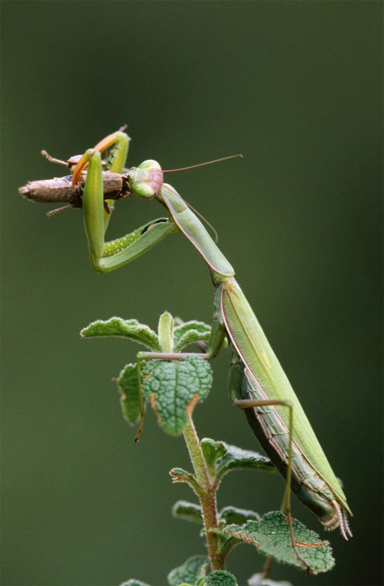 Reine de la chasse à l’affût grâce à son camouflage parfait, la mante religieuse attend le passage de sa prochaine proie cachée dans la végétation. Elle peut rester immobile des heures, ses pattes ravisseuses repliées comme pour prier. Et soudain, ses deux armes se détendent et capturent une bête immédiatement grignotée. Même le mâle de cet insecte vorace finit souvent dévoré la tête la première pendant l’accouplement, ce qui n’empêche pas son abdomen de finir son petit ouvrage.