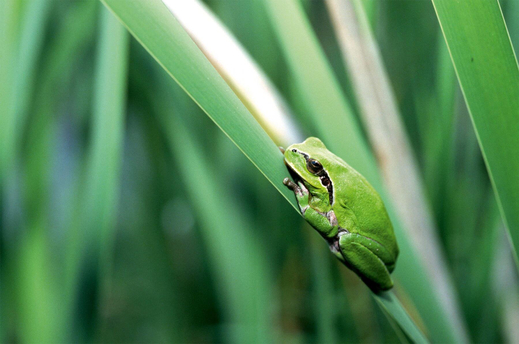 La rainette verte est notre caméléon local. Sa couleur de camouflage provient également d’un mélange entre un pigment jaune et un bleu structural. La teinte s’adapte à celle de son support végétal… mais elle dépend aussi du degré de stress de l’animal ainsi que de la température ambiante. Une peau foncée aide à absorber la chaleur par temps froid. A l’inverse, mieux vaut être clair lors d’une canicule. Rarement, on peut aussi observer une rainette bleue, à cause d'une mutation qui empêche l'expression du pigment jaune.