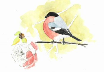 Mon premier oiseau de l'année se signale par son cri lorsque je recharge la mangeoire en graines de tournesol. Un petit son de trompette caractéristique, émis par un mâle de bouvreuil joliment gonflé pour résister au vent. Ce n'est pas le doux sifflement des oiseaux de nos régions, mais l'accent typique d'une variété de bouvreuil venu de grandes forêts de Russie, aux environs de la République des Komis. Les ornithologues l'appellent bouvreuil trompetant. Impossible de ne pas remarquer la teinte délicate du plumage de sa poitrine et de son ventre, en tout point similaire à celle de la rose qu'il côtoie...