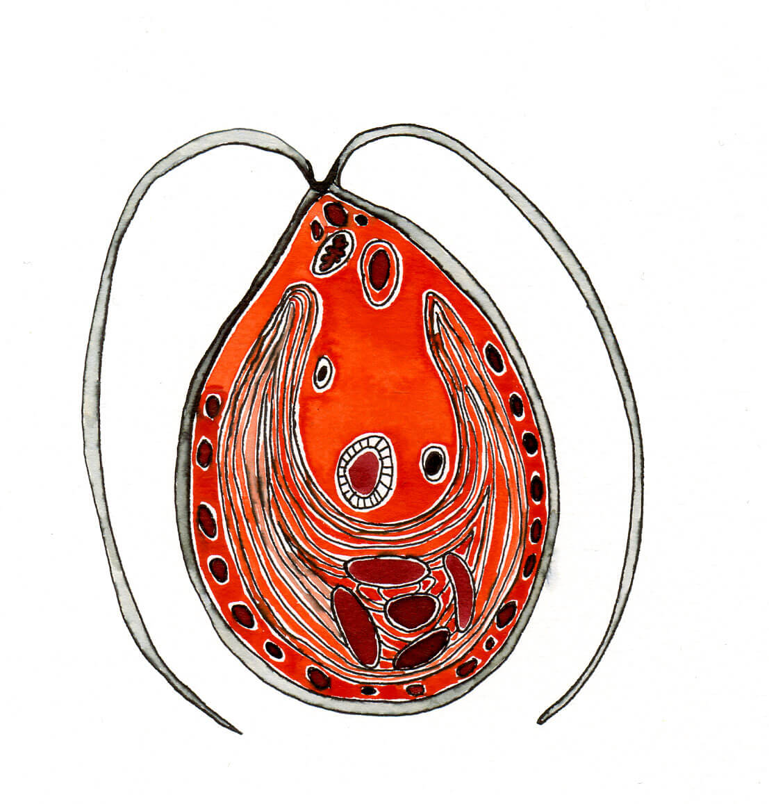 Ce phytoplancton est l'aliment de base d'un protozoaire, Fabrea salina , et d'un minuscule crustacé, Artemia salina , deux autres halophiles extrêmes. Et l'artémie, longue d'à peine 1 cm, est à son tour un mets de choix pour les flamants roses. La couleur que prennent ces échassiers provient directement des pigments de la microalgue, via la minicrevette.