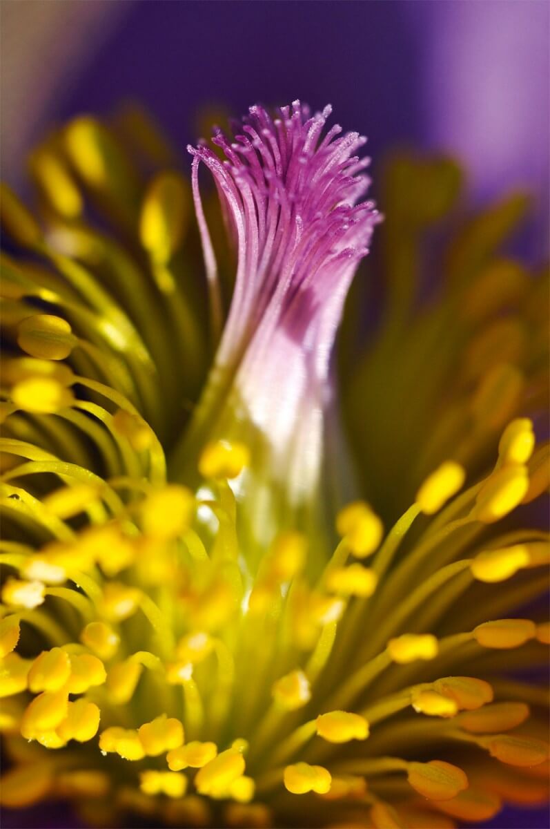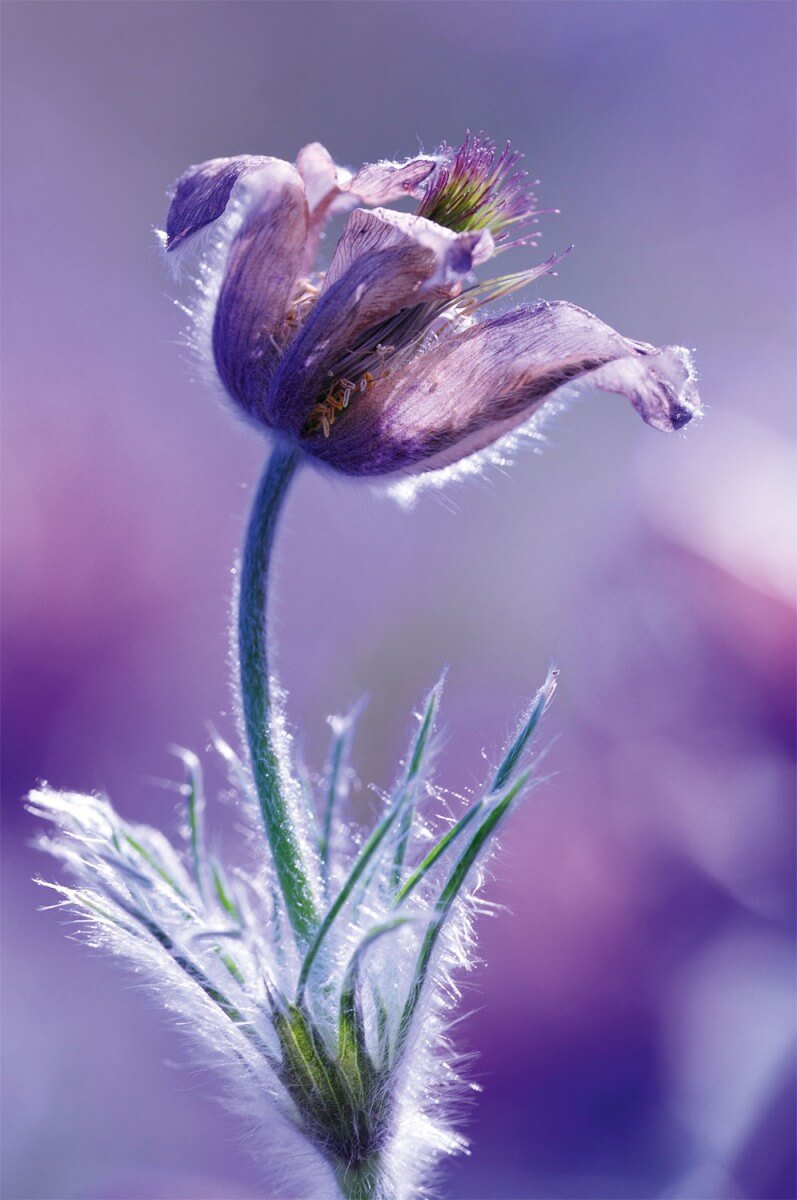 Sur certains coteaux calcaires, de curieux êtres velus émergent de terre début février. Quelques semaines plus tard, ils s’épanouissent en délicates fleurs violet lilacé ou pourpre foncé. Le timide soleil de mars caresse les six tépales de la pulsatille. En retour, une foule dorée et ronde de 200 étamines renvoie à l’astre du jour sa propre image. Avec en son centre, un œil sombre de carpelles.