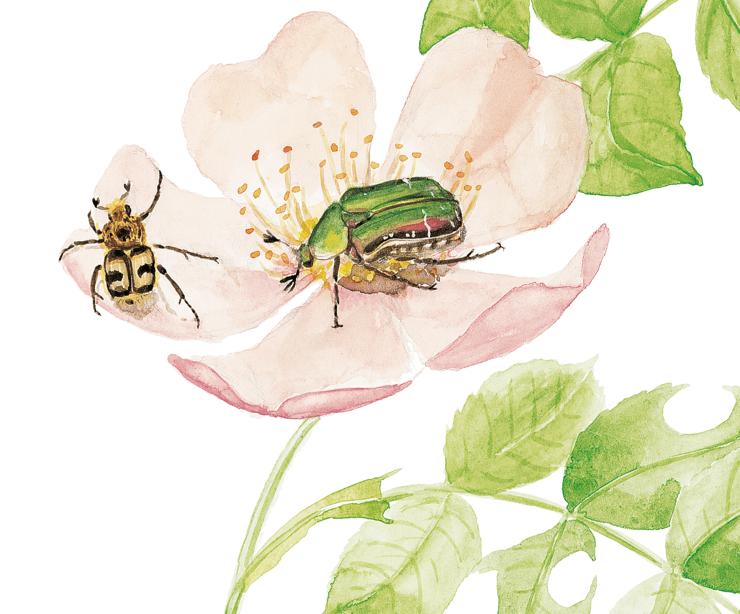 Bijou vert métallisé, la cétoine dorée, ou hanneton des roses ( > à droite ), ne passe pas inaperçue lorsqu'elle se pose sur la corolle des églantines. Elle s'y goinfre de pollen et, dans la foulée, dévore souvent les étamines. La trichie à bandes ( > à gauche ) partage les mêmes goûts que sa cousine, mais de manière un peu plus délicate.