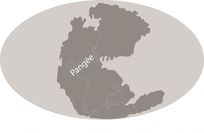 Soumise à d'énormes forces contradictoires durant des dizaines de millions d'années, la Pangée finit par se briser en deux continents. Une mer se forme entre la Laurasie, au nord, et le Gondwana, au sud. Vaste mais peu profonde, on l'appelle Thétys. C'est sur ses bords que précipitent par évaporation de grandes quantités de gypse et de sel sous l'effet du climat tropical.