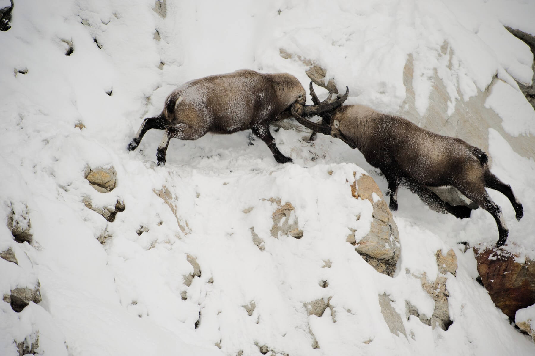1) FAUX Si les affrontements sont rudes, les mâles n’utilisent généralement pas la pointe de leurs cornes. Leur but n’est pas de toucher à mort l’adversaire, mais de démontrer leur supériorité physique avec fair-play. En cas de force clairement inégale, les choses se terminent très vite. Sinon, les affrontements peuvent se prolonger plusieurs heures durant lesquelles il arrive qu’un mâle se blesse à une corne ou à une patte. Parfois, un bouc déstabilisé par un coup peut aussi tomber dans le vide.