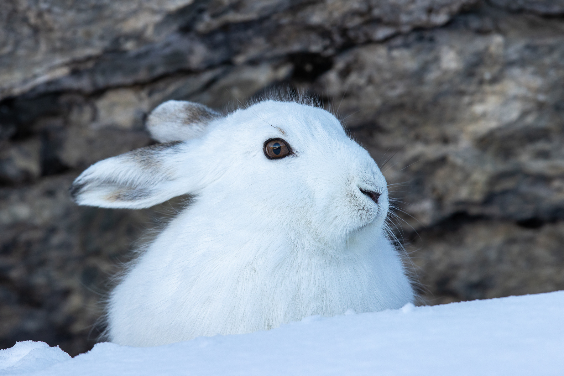 Le soleil s’est déjà levé, toutefois il n’atteindra pas cette pente nord-est. Chargé comme un mulet, je commence à monter. A part un groupe de 18 chamois, il n’y a personne. Je repère plusieurs pistes de lièvre variable et des traces de lagopèdes. Sur quoi miser ? Dilemme ! J’opte pour les premières. Très vite, le sol devient si glissant que je peine à progresser. Vers 2 000 m, je décide alors de mettre les crampons pour m’accrocher à l’espoir de trouver cet animal mythique. Le jeu de pistes reprend et se transforme en un labyrinthe infernal. Le blanchon est monté, descendu, a zigzagué vers le pierrier et puis est revenu sur ses pas 50 m plus haut. J’essaie de suivre et d’anticiper la fin de ses pérégrinations nocturnes aux jumelles pour épargner de précieuses énergies. En fin de matinée, la chance et l’expérience me font cadeau d’un magnifique lièvre blanc blotti sous un rocher ! Le bonheur. J’enfile ma grosse doudoune et l’approche très lentement, non sans difficulté en raison de la topographie accidentée. Gîté à mon tour derrière un bloc, je passe 4 h à l’observer et à le photographier.
