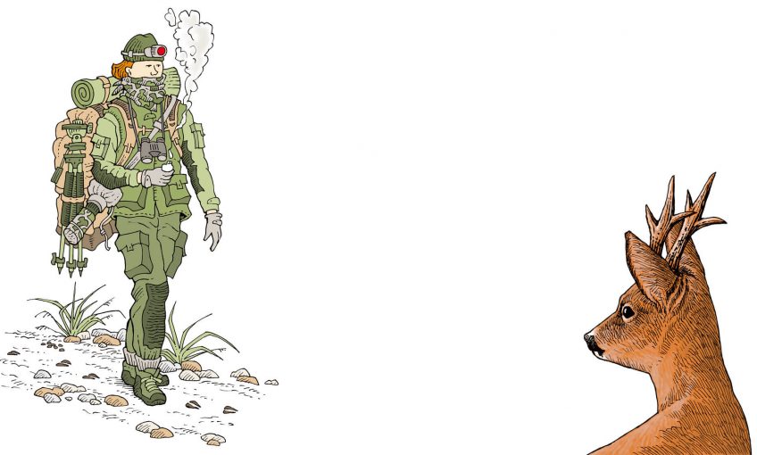Le chevreuil voit mal mais perçoit bien les contrastes. Mettez des habits sombres qui ne font pas de bruit ou emballez-vous dans une toile de camouflage ou un vieux filet de l’armée. Le jean ? Mauvais plan, l’ongulé est daltonien mais sensible au bleu. Pour éviter l’effet tache blanche, cachez visage et mains avec une cagoule et des gants. Mais attention à ne pas effrayer des promeneurs.