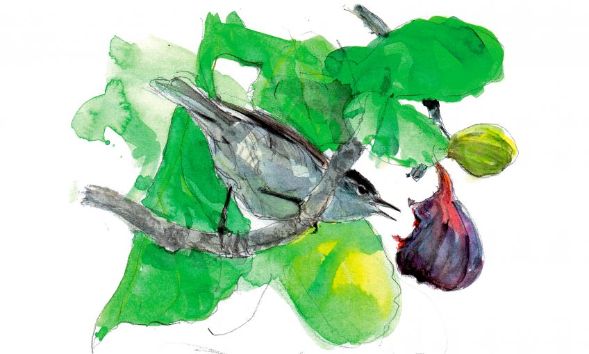 L’expression dit A la Saint-Michel (29 septembre), les figues sont pour les oiseaux. Remarquez les oiseaux migrateurs, papillons, guêpes et autres mouches se régalant des fruits mûrs ou tombés en fin d’été.
