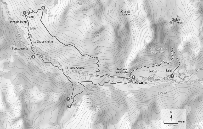 (1) Départ du village de Névache. (7) Arrivée au hameau de Roubion (retour en bus).