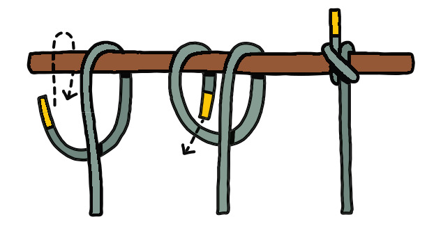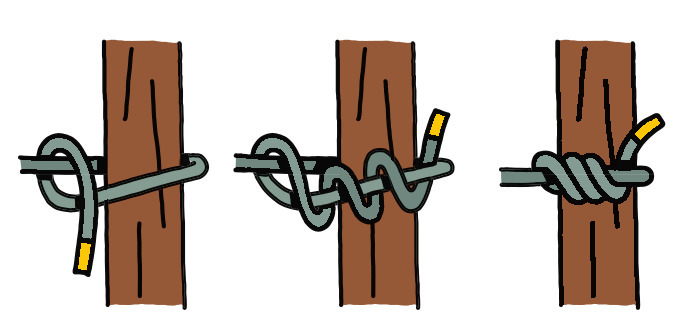 Accroche ta corde de 5 m avec un nœud de cabestan à une solide branche charpentière à 2 m de haut. Tous les 40 cm, fais des nœuds de harnais. Et grimpe à l’aide de l’échelle…