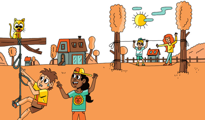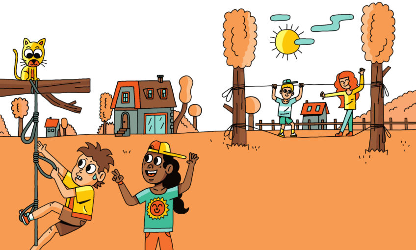 Fixe ta 1 recorde au 1 erarbre à 40 cm du sol avec un nœud de bois. Tends la corde autour du 2 earbre avec un nœud tendeur. Fixe la 2 ecorde de la même manière à ta hauteur d’enfant. À toi de jouer les équilibristes !