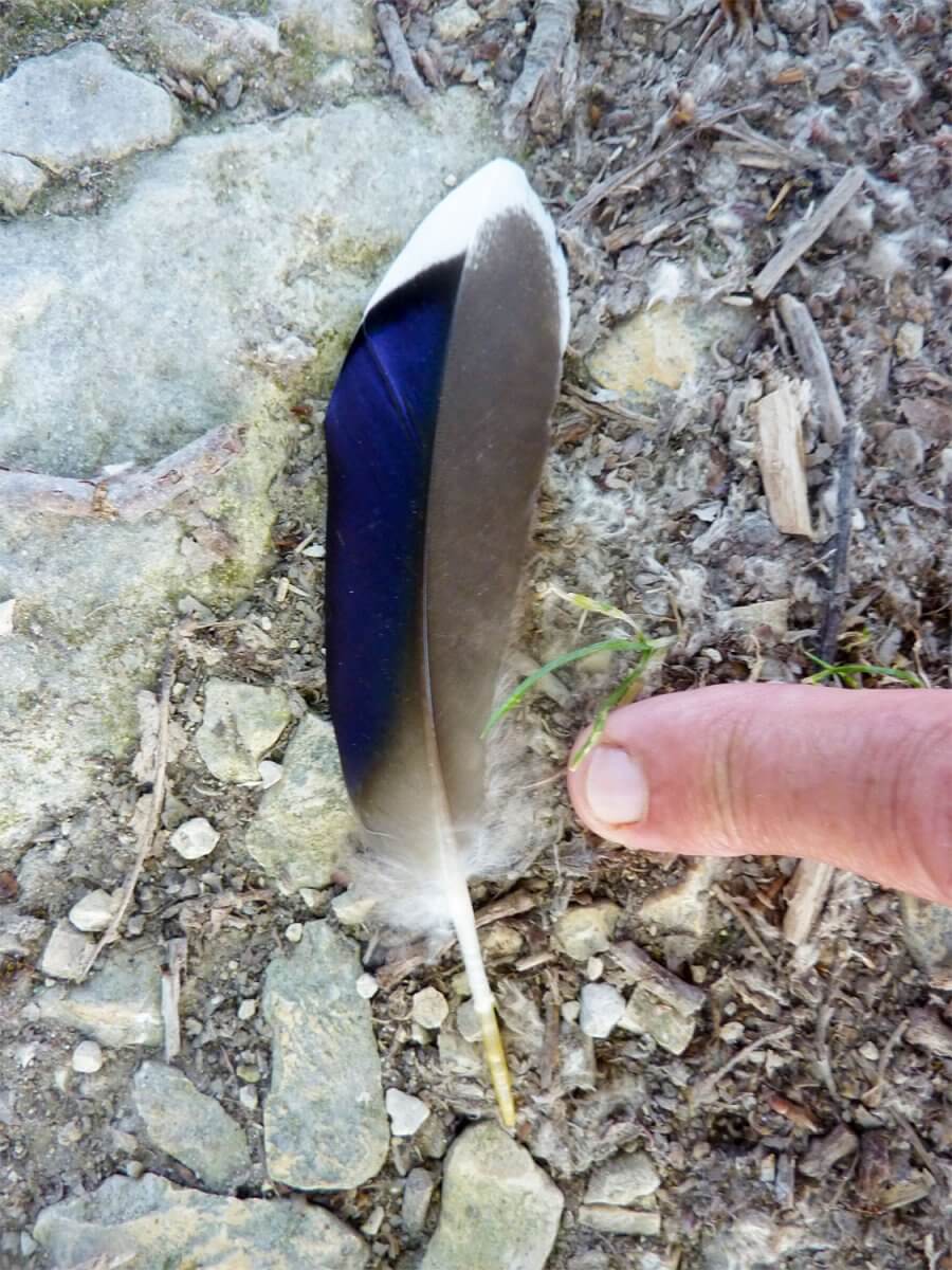 1 | La grande plume grise, brillante d’un seul côté, bout blanc, reflets bleus ? Aucun doute, c’est une rémige de colvert, détachée de son aile