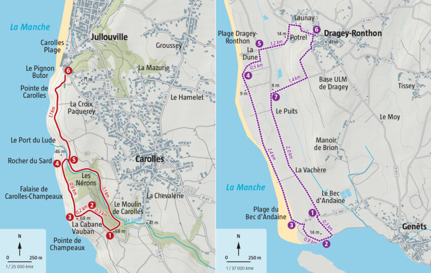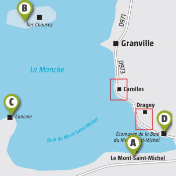 (1) Départ depuis le parking du bec d’Andaine. Prendre le petit sentier vers le sud-est qui mène à la plage et au marais salé . (2) Rejoindre le bec d’Andaine (3) en suivant la dune et la côte vers le nord. Suivre le GR 223 sur environ 2 km puis entrer dans la dune (4). Laisser le GR pour suivre la D143 (5) afin de rejoindre les hameaux de Potrel, Launay puis Dragey. A l’entrée de Dragey (6) bifurquer à droite par les ruelles. Avant de rejoindre la D135 par un virage à droite de 90°, le chemin passe par un point de vue sur le marais, la dune et le Mont-Saint-Michel. Arrivé sur la route départementale (7), la suivre à gauche pour rejoindre le parking (1).