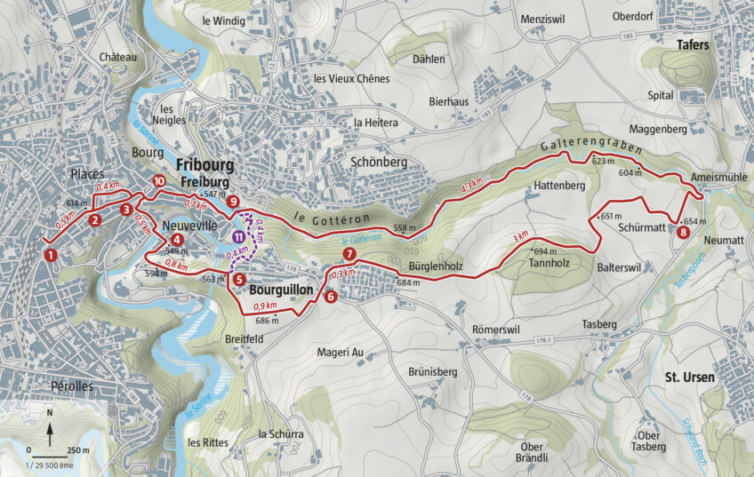 (1) Depuis la gare, suivre le balisage jaune direction Plaffeien. (2) Emprunter la rue Saint-Michel à gauche, tourner à droite, traverser la cour du collège, descendre les escaliers et poursuivre à gauche. (3) Traverser la route et prendre la rue de la Grand-Fontaine à droite, descendre l’escalier du Court-Chemin, puis les Grandes Rames. Traverser le pont de Saint-Jean. (4) Monter la place à droite et suivre le chemin de Lorette. (5) Monter le chemin du Breitfeld à droite, puis prendre l’allée de tilleuls à gauche. (6) Suivre les panneaux direction Schürmatt. (7) Prendre le sentier forestier. (8) Suivre le balisage direction Fribourg. (9) Traverser le pont de Berne et tourner à droite. Monter les escaliers et partir à gauche. (10) Longer la cathédrale et prendre la rue des Epouses à gauche. Remonter la rue de Lausanne et continuer tout droit jusqu’à la gare.