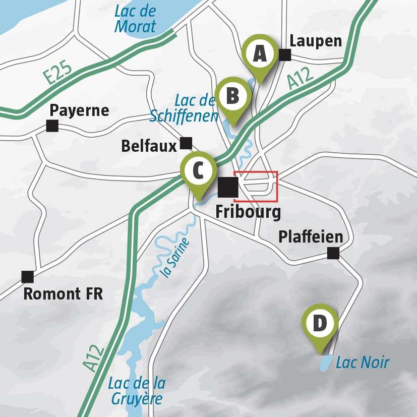 (1) Depuis la gare, suivre le balisage jaune direction Plaffeien. (2) Emprunter la rue Saint-Michel à gauche, tourner à droite, traverser la cour du collège, descendre les escaliers et poursuivre à gauche. (3) Traverser la route et prendre la rue de la Grand-Fontaine à droite, descendre l’escalier du Court-Chemin, puis les Grandes Rames. Traverser le pont de Saint-Jean. (4) Monter la place à droite et suivre le chemin de Lorette. (5) Monter le chemin du Breitfeld à droite, puis prendre l’allée de tilleuls à gauche. (6) Suivre les panneaux direction Schürmatt. (7) Prendre le sentier forestier. (8) Suivre le balisage direction Fribourg. (9) Traverser le pont de Berne et tourner à droite. Monter les escaliers et partir à gauche. (10) Longer la cathédrale et prendre la rue des Epouses à gauche. Remonter la rue de Lausanne et continuer tout droit jusqu’à la gare.