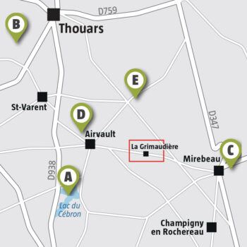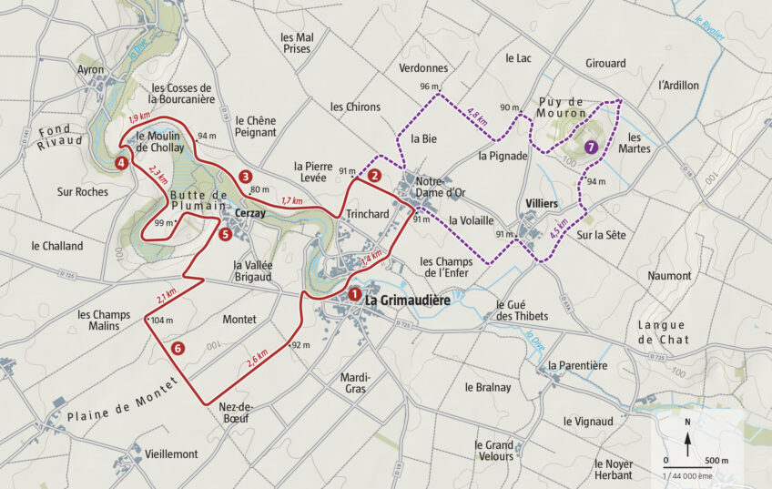 (1) Parking près de la mairie. Remonter la D19, rue de la Mairie puis rue des Lavoirs qui traverse la Dive et remonte vers le nord. Au croisement avec la D63, prendre en face direction l’église Notre-Dame-d’Or. (2) Tourner le dos à l’église puis suivre le chemin agricole. Bifurquer vers le sud en longeant la même parcelle, puis reprendre la D19 à droite au hameau de Trinchard. Après un peu plus de 200 m, tourner à gauche pour longer la vallée de la Dive. (3) Suivre le sentier sur 1,5 km avant de remonter vers la plaine cultivée. Descendre au Moulin de Chollay, puis traverser la Dive. (4) Prendre le chemin de gauche qui traverse les cultures, en direction des peupleraies. Au bout, prendre à droite pour longer les cultures avec les peupliers sur la droite. (5) Au hameau de Cerzay, prendre la rue du Moulin vers le sud et la D725. Longer la route puis bifurquer à droite. Descendre le chemin jusqu’à la prochaine intersection. (6) Traverser la vallée sèche, puis prendre à gauche au second chemin agricole. Remonter jusqu’à la D725. Prendre en face la rue du Calvaire, puis à droite pour retrouver la mairie.