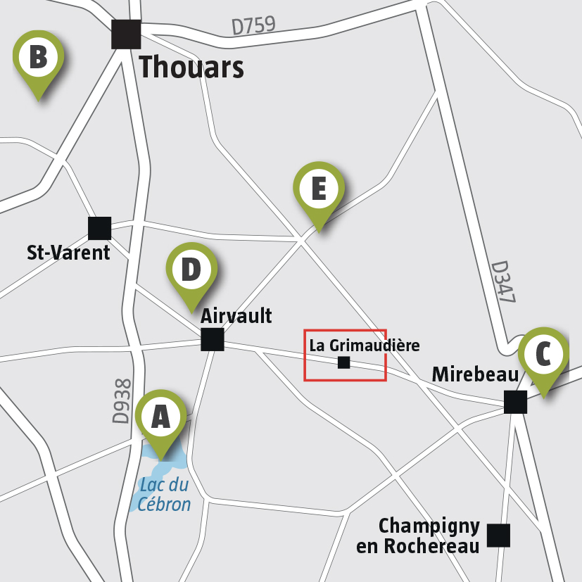 (1) Parking près de la mairie. Remonter la D19, rue de la Mairie puis rue des Lavoirs qui traverse la Dive et remonte vers le nord. Au croisement avec la D63, prendre en face direction l’église Notre-Dame-d’Or. (2) Tourner le dos à l’église puis suivre le chemin agricole. Bifurquer vers le sud en longeant la même parcelle, puis reprendre la D19 à droite au hameau de Trinchard. Après un peu plus de 200 m, tourner à gauche pour longer la vallée de la Dive. (3) Suivre le sentier sur 1,5 km avant de remonter vers la plaine cultivée. Descendre au Moulin de Chollay, puis traverser la Dive. (4) Prendre le chemin de gauche qui traverse les cultures, en direction des peupleraies. Au bout, prendre à droite pour longer les cultures avec les peupliers sur la droite. (5) Au hameau de Cerzay, prendre la rue du Moulin vers le sud et la D725. Longer la route puis bifurquer à droite. Descendre le chemin jusqu’à la prochaine intersection. (6) Traverser la vallée sèche, puis prendre à gauche au second chemin agricole. Remonter jusqu’à la D725. Prendre en face la rue du Calvaire, puis à droite pour retrouver la mairie.