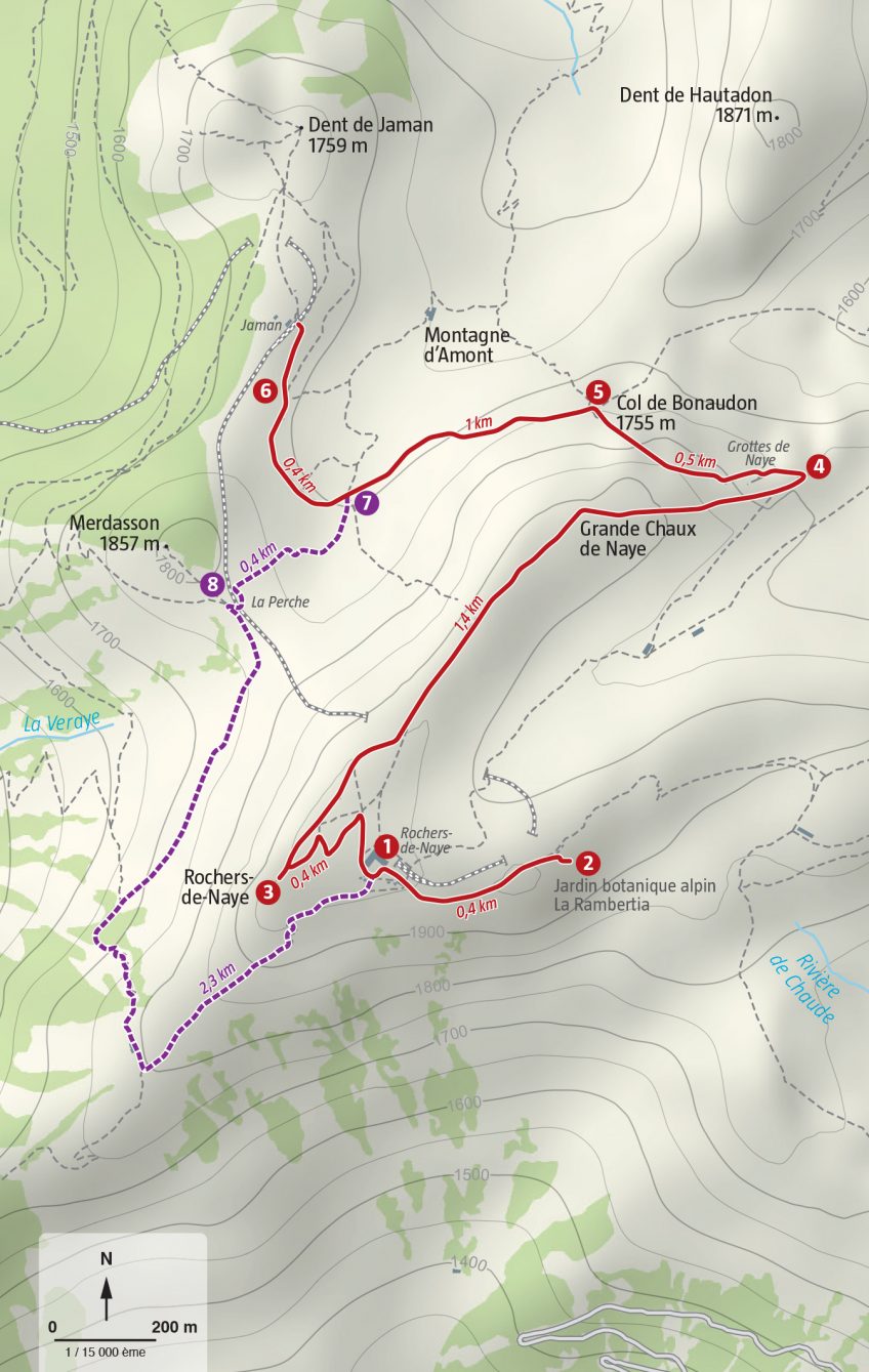 (1) Depuis la gare de Rochers-de-Naye, suivre le sentier qui mène au jardin botanique alpin La Rambertia. (2) Après la visite du jardin, revenir sur ses pas jusqu’à la gare, puis monter jusqu’au sommet des Rochers-de-Naye pour profiter de la vue sur le lac Léman. (3) Prendre le chemin qui longe la crête. (4) Suivre la direction des grottes de Naye. La traversée souterraine dure environ 20 min. (5) Au col de Bonaudon, suivre la direction de la station de Jaman. (6) Monter 50 m de dénivelé jusqu’à la gare de Jaman pour reprendre le train.
