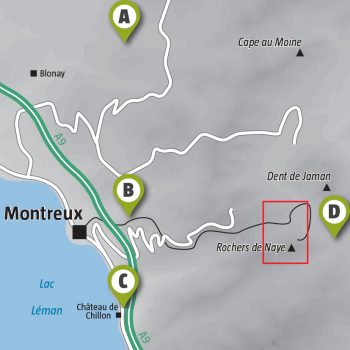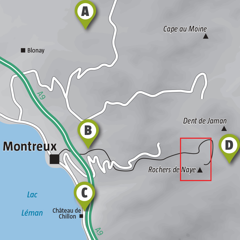 (1) Depuis la gare de Rochers-de-Naye, suivre le sentier qui mène au jardin botanique alpin La Rambertia. (2) Après la visite du jardin, revenir sur ses pas jusqu’à la gare, puis monter jusqu’au sommet des Rochers-de-Naye pour profiter de la vue sur le lac Léman. (3) Prendre le chemin qui longe la crête. (4) Suivre la direction des grottes de Naye. La traversée souterraine dure environ 20 min. (5) Au col de Bonaudon, suivre la direction de la station de Jaman. (6) Monter 50 m de dénivelé jusqu’à la gare de Jaman pour reprendre le train.