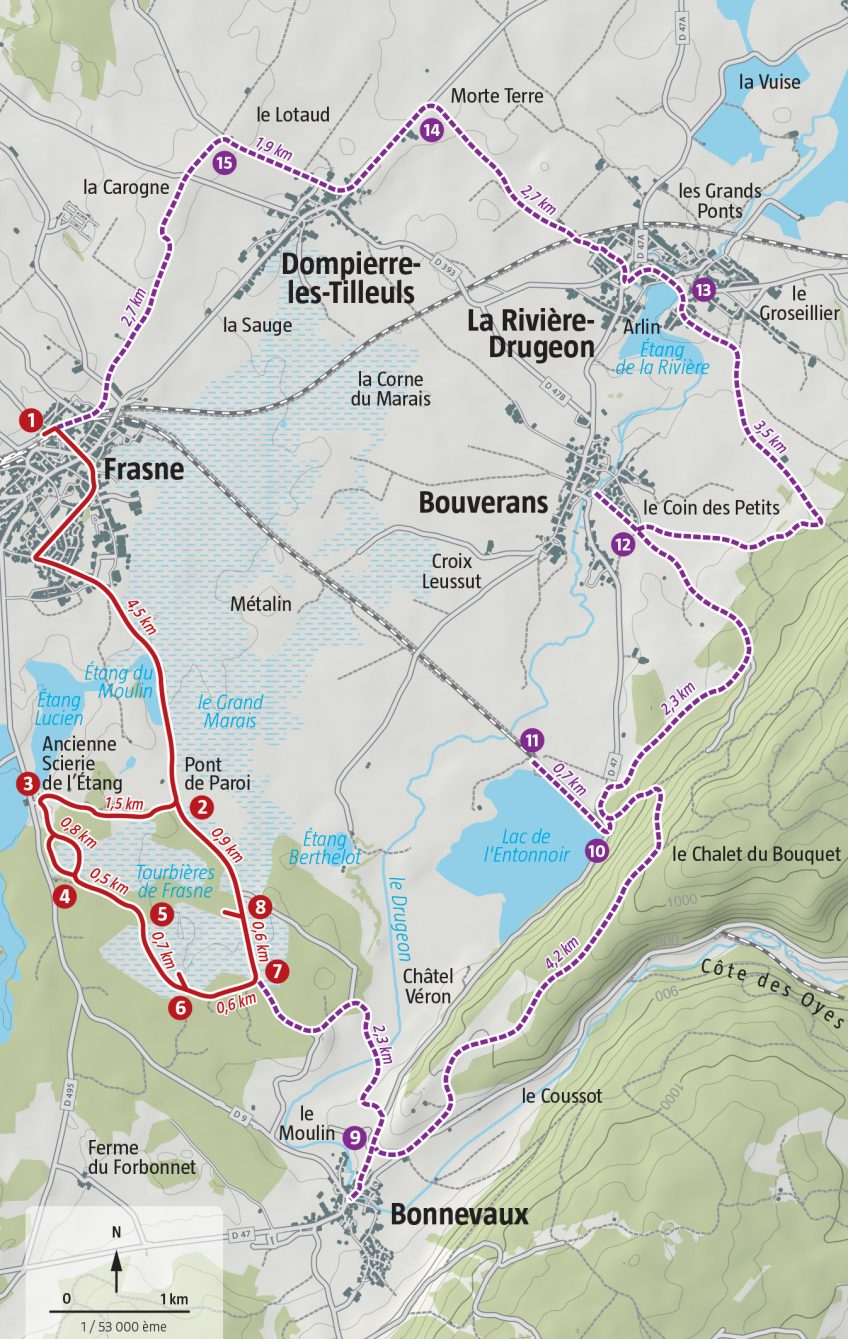 Au (7) tourner à droite. (9) Prendre à droite direction le village pour visiter La Pastorale, une ferme typique. Sinon à gauche, suivre la ligne verte piétonne Bonnevaux-Bouverans. (10) Espace naturel sensible du lac de Bouverans. (11) Un aller-retour possible pour pause pique-nique au ponton du lac. (12) Départ possible depuis la salle des fêtes de Bouverans. (13) Rives de l’étang de La Rivière-Drugeon. (14) Prendre à gauche et longer la D471. (15) Table de pique-nique vers une chapelle entourée de tilleuls pluricentenaires. Retour direction Frasne.