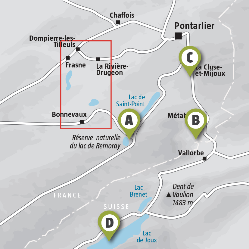 D) Le lac de Joux Allongé entre deux plis verdoyants du Jura, le lac de Joux est une destination prisée par les touristes, mais aussi par les amateurs de nature. A découvrir avec notre balade Petite bise sur la Joux.