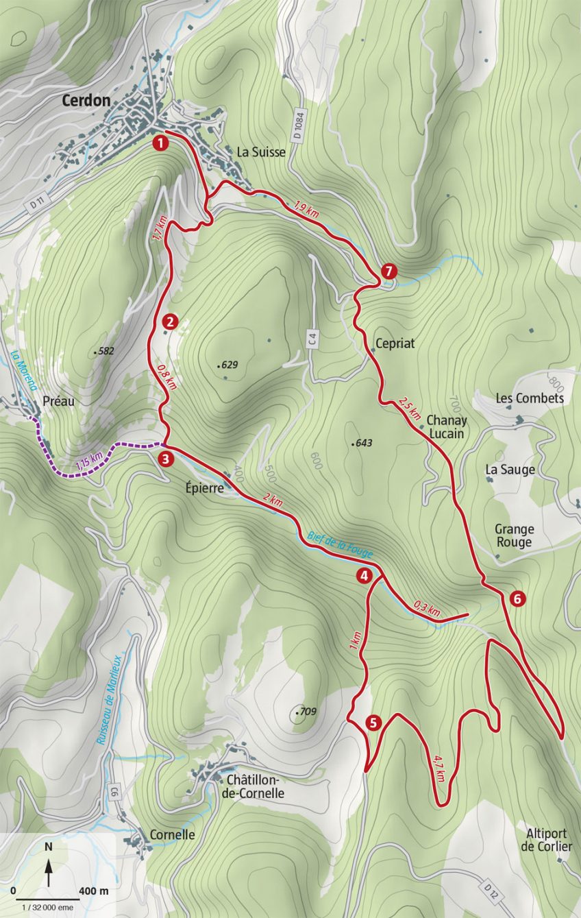 (1) Depuis le centre de Cerdon, remonter la rue du Marquis (circuit des cascades). Puis couper la D1084 pour prendre à droite le chemin qui monte vers les vignes. (2) Au col de Crêt du Jour, prendre un petit chemin à gauche dans le pré (balisage jaune). (3) Arrivé à l’entrée de l’ancienne abbaye, passer le petit pont en pierre et remonter le sentier le long du cours d’eau. (4) Aller jusqu’à la cascade de la Fouge avant de revenir sur ses pas et suivre le chemin qui monte (balisage jaune et rouge jusqu’à la fin de la boucle, direction Cerdon). (5) Remonter la départementale sur 400 m, avant de prendre une large piste sur la gauche. (6) Traverser le ruisseau, avant une dernière montée. (1) Au pont, traverser la D1084 et descendre par un sentier dans le val d’Enfer.