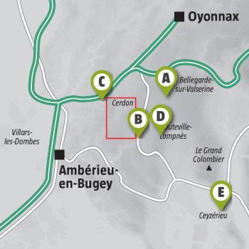 (1) Depuis le centre de Cerdon, remonter la rue du Marquis (circuit des cascades). Puis couper la D1084 pour prendre à droite le chemin qui monte vers les vignes. (2) Au col de Crêt du Jour, prendre un petit chemin à gauche dans le pré (balisage jaune). (3) Arrivé à l’entrée de l’ancienne abbaye, passer le petit pont en pierre et remonter le sentier le long du cours d’eau. (4) Aller jusqu’à la cascade de la Fouge avant de revenir sur ses pas et suivre le chemin qui monte (balisage jaune et rouge jusqu’à la fin de la boucle, direction Cerdon). (5) Remonter la départementale sur 400 m, avant de prendre une large piste sur la gauche. (6) Traverser le ruisseau, avant une dernière montée. (1) Au pont, traverser la D1084 et descendre par un sentier dans le val d’Enfer.