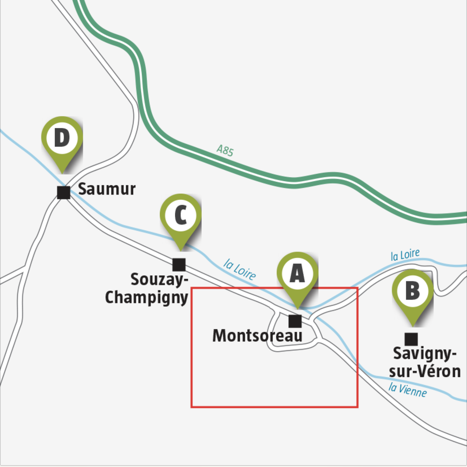(1) Depuis la place du mail de Montsoreau, en tournant le dos au fleuve, prendre à gauche et monter vers le chemin du coteau. (2) Au croisement, tourner à gauche vers le château, puis à droite. (3) A Candes-Saint-Martin, longer l’église puis descendre vers la Vienne. (4) Aussitôt après avoir longé l’île, tourner à droite et suivre le chemin. (5) Juste après les deux habitations, prendre directement à droite et suivre le chemin. (6) Après la forêt, tourner à droite pour faire le tour de l’abbaye de Fontevraud. (7) Après l’abbaye, prendre la deuxième à droite. (8) Traverser la route puis prendre à gauche puis à droite et suivre le chemin. (9) Au croisement, prendre à droite. (10) Traverser la route et prendre le chemin entre les vignes pour rejoindre Turquant. (11) Au village, suivre les panneaux vers le port de Turquant. (12) Devant la Loire, prendre à droite pour rejoindre Montsoreau.