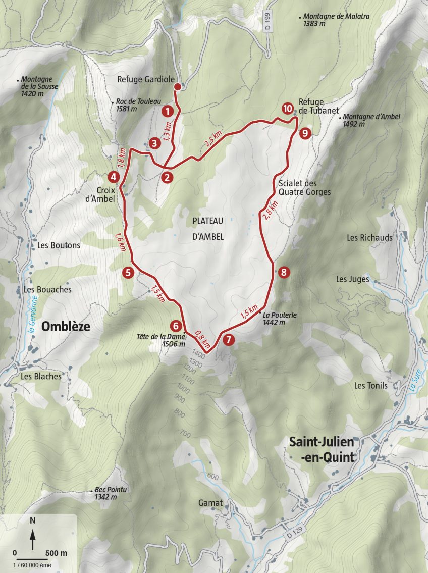 Source : rando.parc-du-vercors.fr Départ de Gardiol (parking), prendre la direction de la Tête de la Dame. (6) Filer au sud, passer par la Combe de la Louvaterre (1) et rejoindre Le Verâtre (2) (jonction GR 93). Aller sur la droite direction le Refuge d’Ambel (3) puis le Pas du Gouillat. (4) Laisser le GR qui part à droite et continuer en longeant les crêtes jusqu’au carrefour Les Sarnats, (5) le sentier grimpe pour atteindre la Tête de la Dame. La suite en bordure de falaise passe par le Pas de Rouisse (7) et Les Moutons (8).Prendre vers le nord en traversant le plateau d’Ambel vers le carrefour Pâturage de Tubanet (9). Au Refuge de Tubanet (10), retour au parking de Gardiol par le GR 93.
