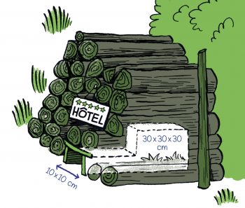 Cabane 5 étoiles : Tas de bois au fond du jardin avec une chambre aménagée et un couloir d’accès. Toit étanche et matériaux bien secs (foin, feuilles…) pour isoler. Super pièce spéciale hibernation !