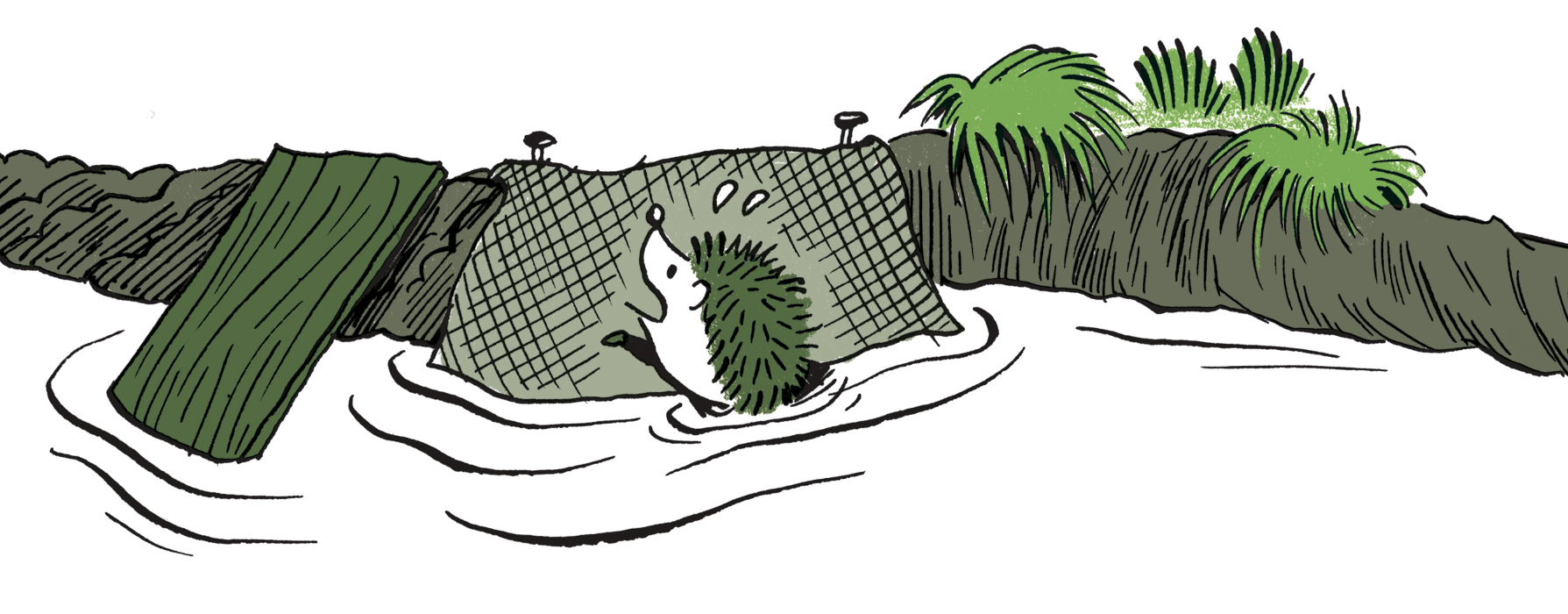 Bassin antinoyade : Une planche sur la rive ou de la toile de jute si les berges sont trop abruptes pour sauver le hérisson de la noyade.