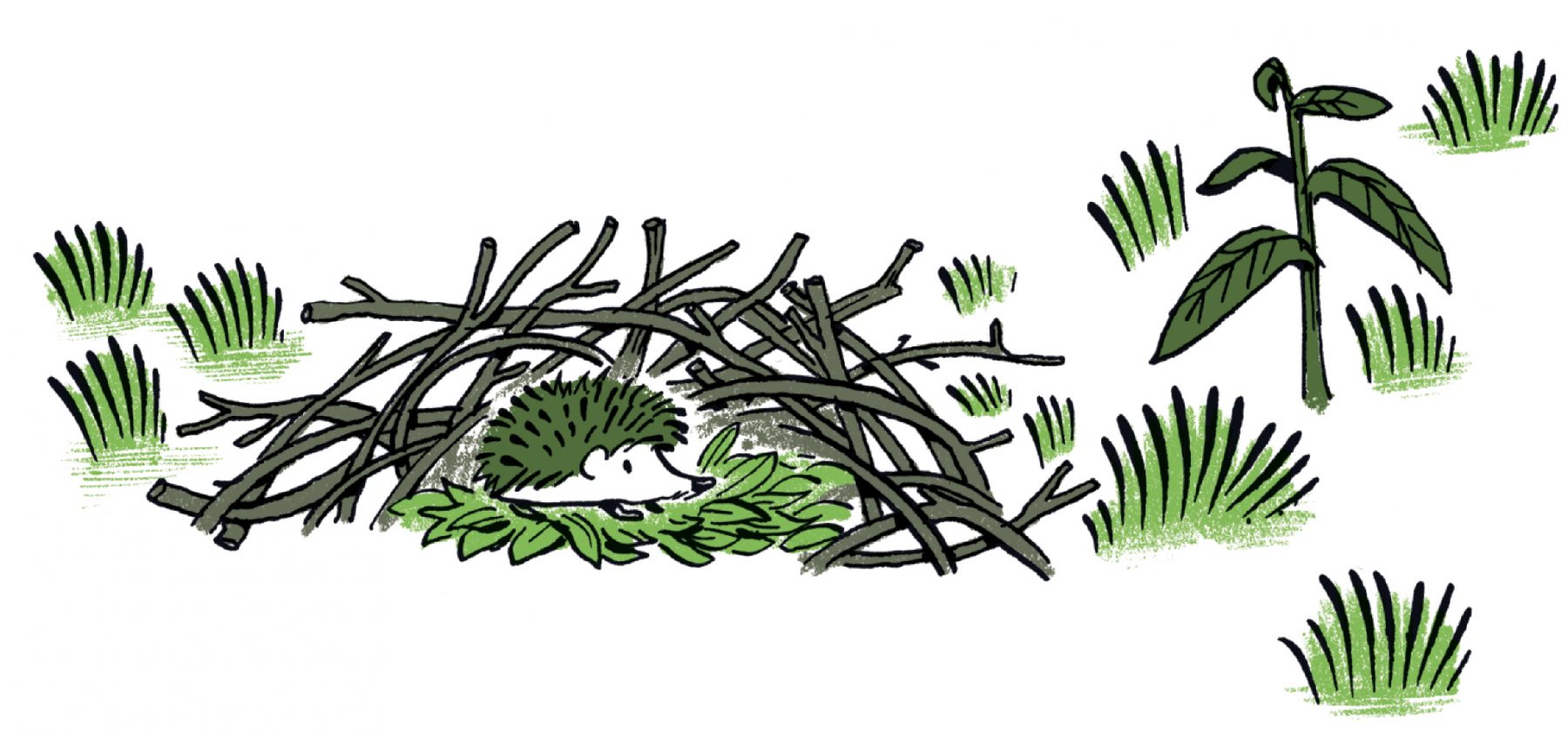 Gîte familial : dans la haie, tas de paille ou feuilles sous des entrelacs de branchettes. Madame hérisson y fera son nid et s’y abritera en journée avec ses petits.