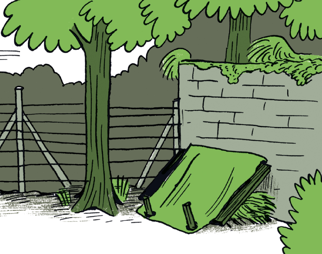 Refuge pour l'hiver : Plaque de bois contre un vieux mur, recouverte d’une bâche et garnie de foin ou de feuilles.