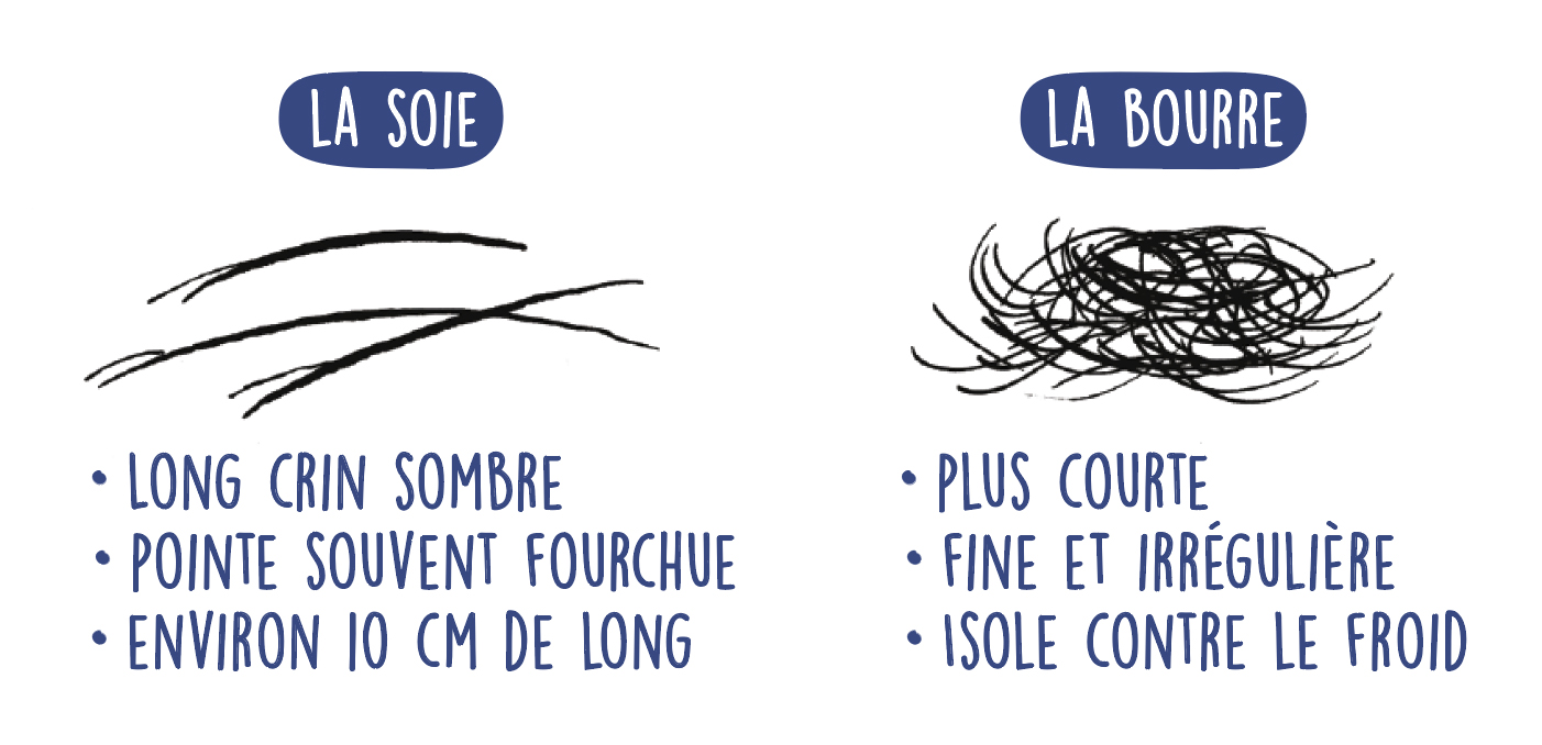 Poils : regarde bien les arbres frottés, tu y trouveras des poils coincés dans la boue, l’écorce ou la sève de l’arbre. Il en existe de deux sortes :