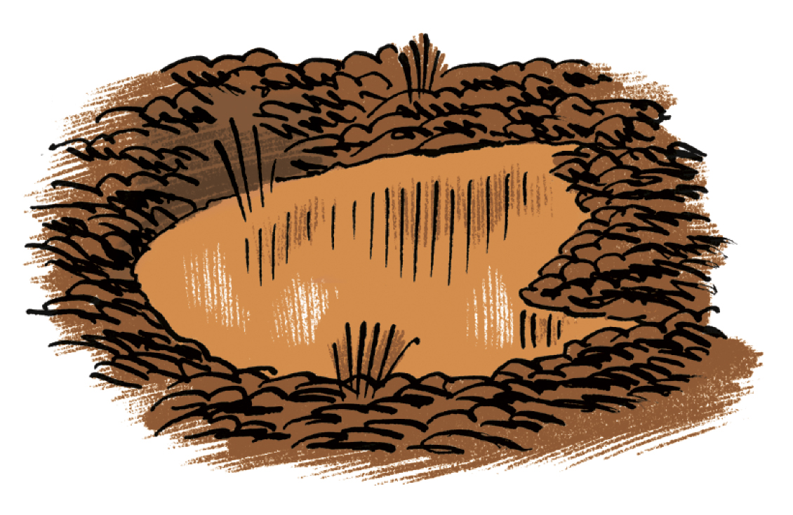 Souille : c’est une cuvette dans la boue humide qui se remplit d’eau. Les sangliers adorent s’y vautrer.