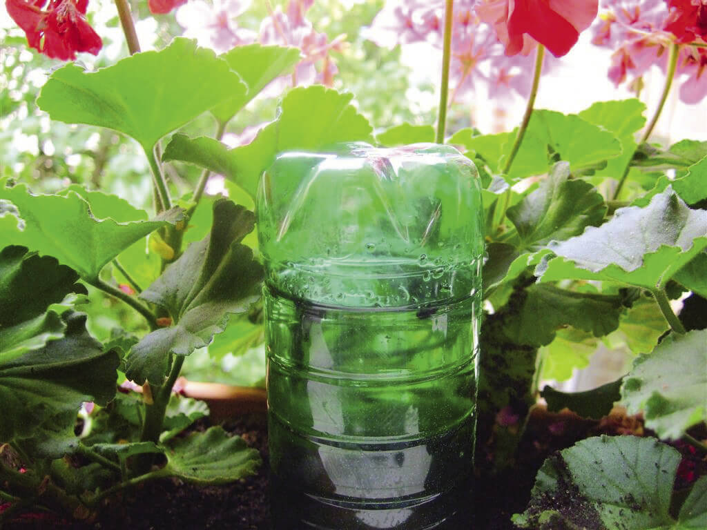 Vous pouvez faire un goutte-à-goutte idéal avec une simple bouteille en plastique : remplissez-la d’eau et bouchez-la soigneusement. Avec un clou et un marteau, faites un trou dans le fond de la bouteille, ainsi que 4 petits trous dirigés dans des directions opposées sur les côtés du goulot. Retournez votre bouteille et observez l’eau s’écouler au goutte-à-goutte. Si l’eau coule en filet, vos trous sont trop gros, si elle ne s’écoule pas, ils sont trop petits. Quand vous avez le bon débit, installez la bouteille tête en bas dans le pot de fleurs. Avec ce système, vous pourrez partir quelques jours en vacances sans craindre que vos plantes s’assèchent. Et n’oubliez pas de mettre des coupelles sous vos pots pour récupérer l’excès d’eau.
