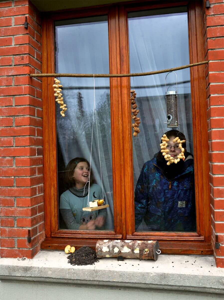 Tandis que Camille préparait les graines de tournesol, Nathan a pris soin de poser sa mangeoire dans l’axe de la fenêtre bien sûr, mais surtout en hauteur au milieu de la pelouse. Les chats du quartier seront ainsi vite repérés par les passereaux. La seconde règle est en effet de pratiquer le nourrissage hivernal dans un endroit dégagé, là où les prédateurs ne peuvent pas se cacher.