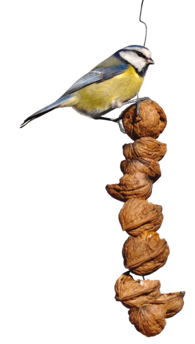 Pour les mésanges acrobates, enfilez des moitiés de noix ou des arachides sur un fil de fer. Puis suspendez-le à un coin de la mangeoire ou à une branche.